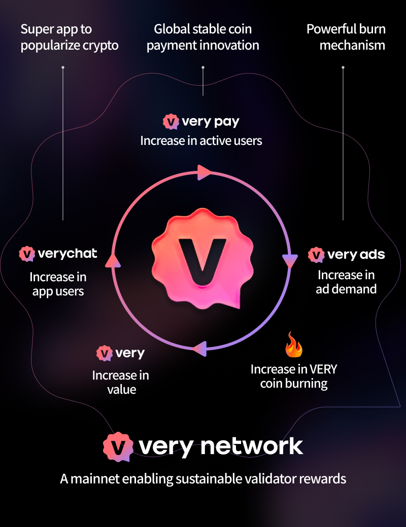 The coin issued on the Very Network mainnet, $VERY, is the unique Social Currency used within Verychat. As user numbers increase and with it the demand for advertising, the demand for $VERY will also grow. The revenue generated will complete the innovation of an inflation-free reward system through node validators, staking, fruit rewards, invitation rewards, ecosystem rewards, and ongoing burns.